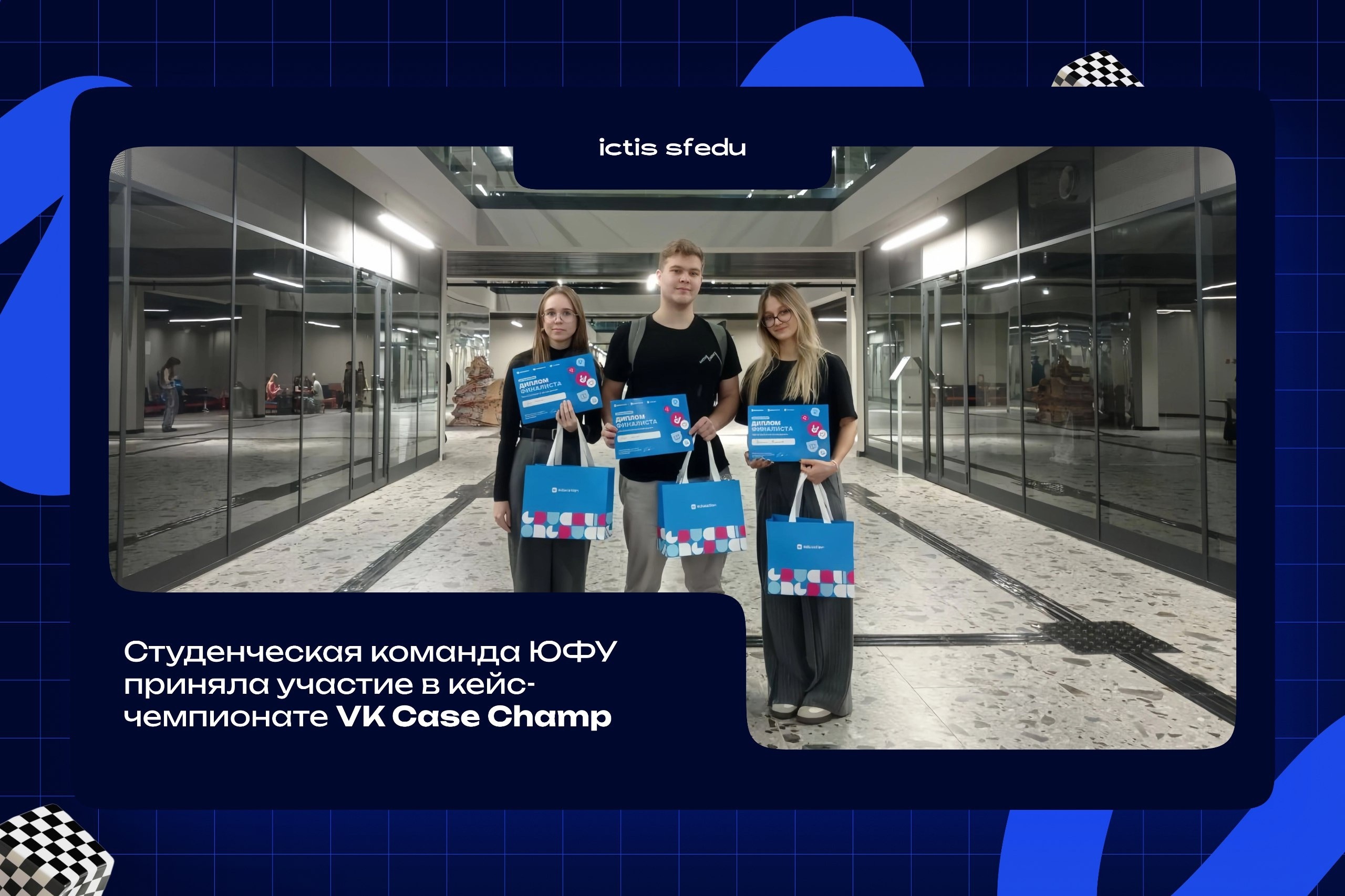 В ноябре ВКонтакте провели традиционный кейс-чемпионат VK Case Champ. В интеллектуальном состязании приняла участие команда Южного федерального университета в составе студентов ИКТИБ Кристины Кострюковой, Яны Чопоровой, Ильи Акимова и студентки ИФЖиМКК ЮФУ Дарьи Феоктистовой.